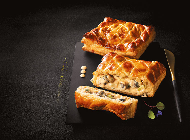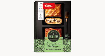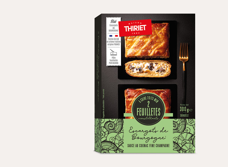 Pate feuilletée 53,3% (farine de blé (gluten (blé)) (origine France) 25%, beurre (lait) 16%, eau, œuf de poules élevées en plein air (oeufs), sel), chair d'escargot cuite 14% (escargot de Bourgogne Helix pomatia (mollusques), sel, épices, plantes aromatiques (céleri)), crème fraîche épaisse (lait) (origine France) 12,6%, poireau, eau, beurre (lait) 2,4%, oignon, farine de blé (gluten (blé)) (origine France) 1,7%, Cognac Fine Champagne modifié 1,2% (Cognac Fine Champagne, sel, arôme naturel de poivre, colorant : caramel ordinaire), lait en poudre (lait), sel, amidon transformé, persil, ail, poivre blanc