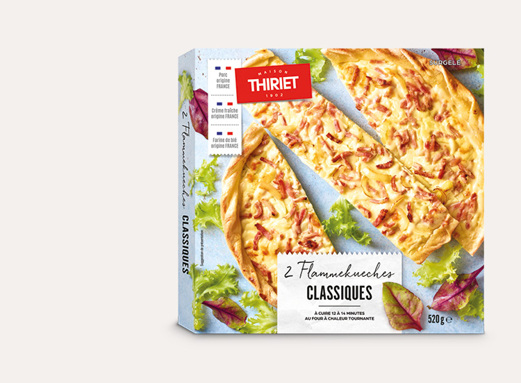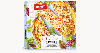 Déposez la flamm'kueche encore surgelée sur une plaque chaude (sans papier cuisson). Enfournez à mi-hauteur et laissez cuire 12 à 14 minutes (14 à 16 minutes dans un four traditionnel). Dégustez immédiatement.