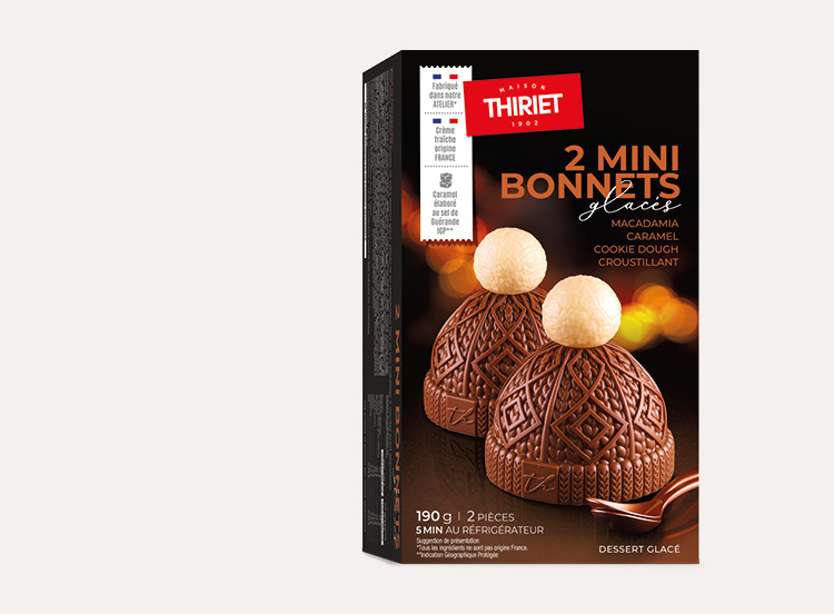 Vous avez aimé nos bonnets glacés, nos mini bonnets vont vous rappeler des souvenirs ! Un dessert glacé individuel résolument généreux et ultra gourmand : une crème glacée macadamia onctueuse - à la crème origine France - et parsemée de croustillant au chocolat au lait et praliné, des morceaux de cookie dough ultra gourmands, et du caramel fondant. Un dessert individuel qui a tout d’un grand, à la fois crémeux, croustillant et fondant, pour un plaisir intense à chaque bouchée.