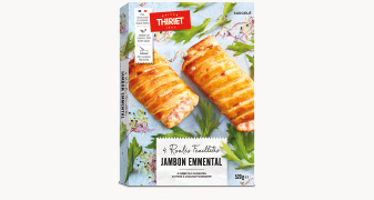 Dénomination de vente : Produit surgelé. 4 feuilletés garnis d'une préparation à base de jambon cuit supérieur et d'emmental, crus, à cuire