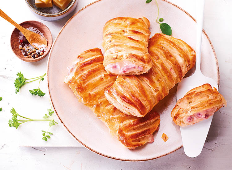 Ce rouleau de pâte feuilletée pur beurre renferme une délicieuse sauce béchamel à la crème fraîche et à l'emmental (origine France) et morceaux de jambon cuit supérieur sans nitrite ajouté (porc origine France).