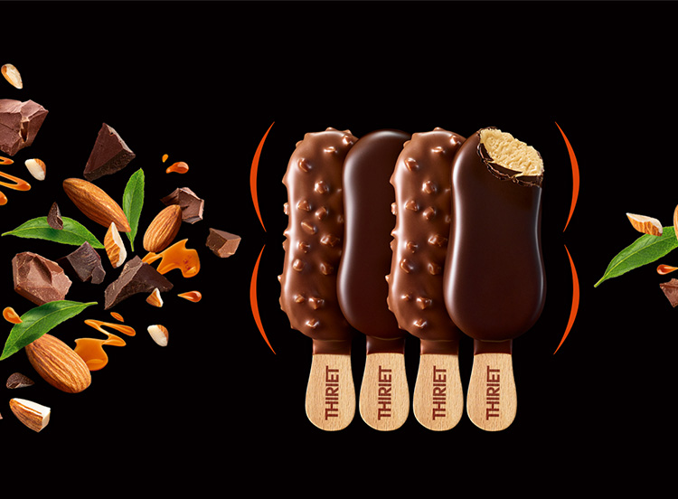 Dénomination de vente : Produit surgelé. Crème glacée caramel salé à la crème fraîche 65,2%, enrobage chocolat au lait avec éclats d'amande ou chocolat noir 34,8%