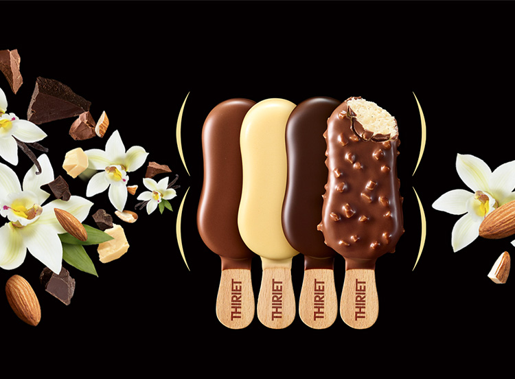 Dénomination de vente : Produit surgelé. Crème glacée vanille de Madagascar à la crème fraîche 66,5%, enrobage chocolat au lait avec éclats d’amande ou chocolat au lait ou chocolat blanc ou chocolat noir 33,5%