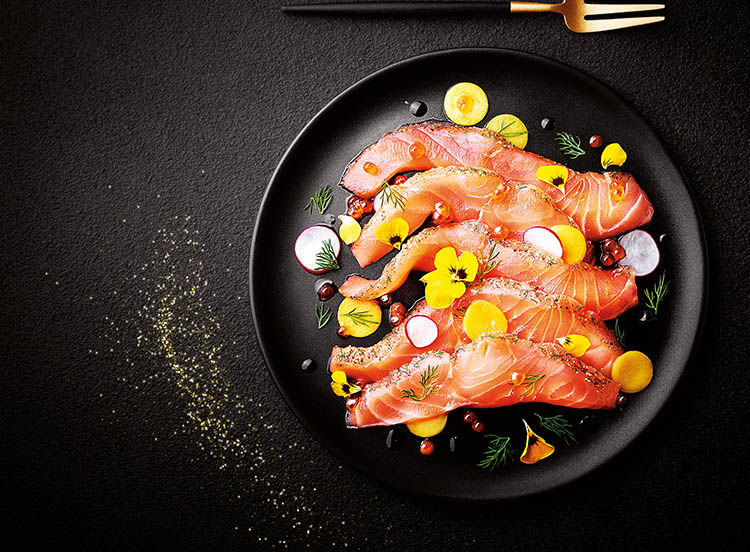 Des émincés de saumon gravlax, marinés 24 heures dans le de sel, le sucre, un mélange d’épices (poivre noir, graine de moutarde, genièvre, coriandre) et aneth, donnant ainsi au saumon un moelleux et des saveurs inégalables.