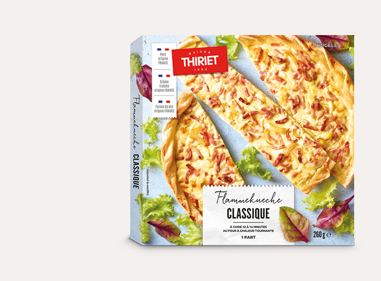 Dénomination de vente : Produit surgelé. Tarte flambée à la crème fraîche et aux lardons fumés.