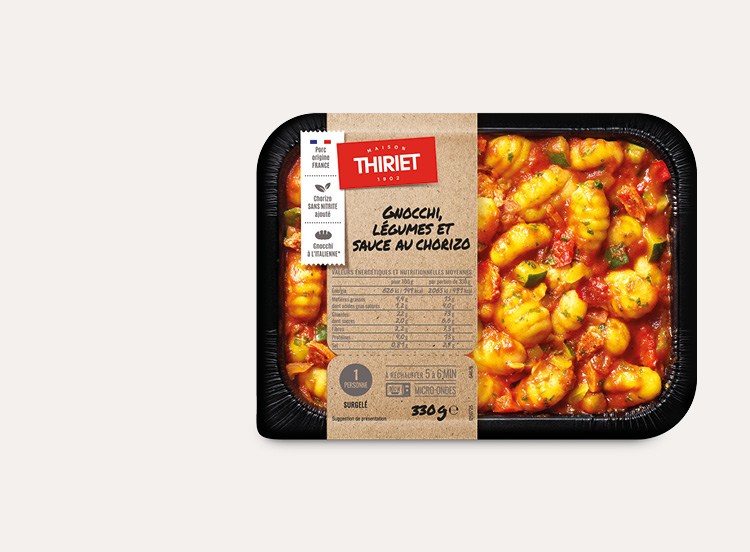 Dénomination de vente : Produit surgelé. Gnocchi sauce tomate au chorizo et légumes