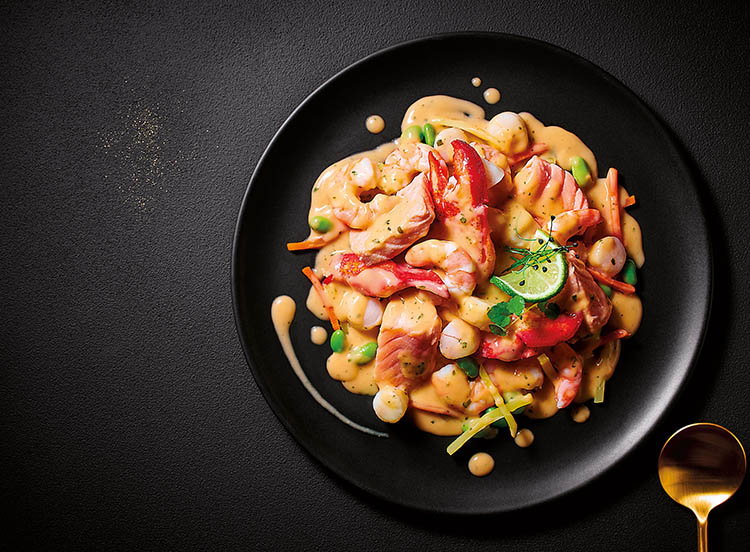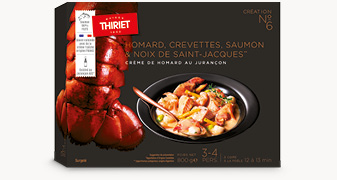 Un savoureux mélange de tendres morceaux de poissons et fruits de mer : queues de crevettes décortiquées, filet de saumon, homard et noix de Saint-Jacques** ; accompagnés de fèves de soja, de juliennes de carottes jaunes et orange et d'une crème de homard au Jurançon AOC*. Vos invités n'en reviendront pas !