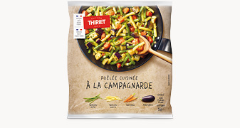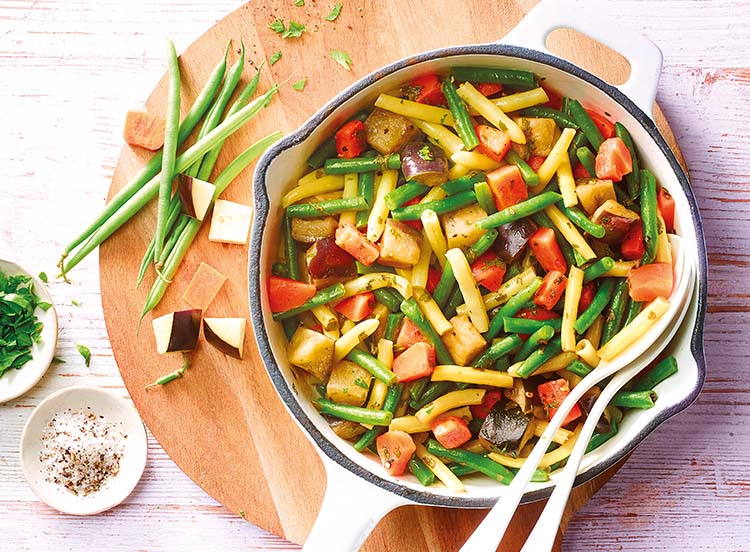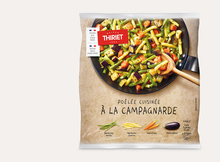 Poêlée à la campagnarde composée de haricots verts et haricots beurre origine France, carottes, aubergines et oignons, délicatement relevée d'huile d'olive, ail, persil, oignon frit et poivre blanc. À savourer en accompagnement d'une viande grillée.