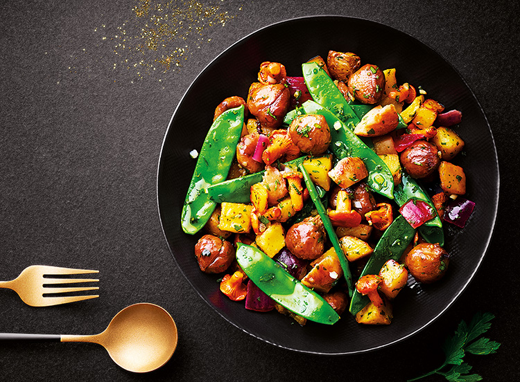 Une savoureuse et originale poêlée composée de marrons, de pommes de terre origine France préfites, de pois gourmands et de champignons tels que des girolles et des cèpes. Déjà assaisonnée, il ne vous reste plus qu'à la déguster. Servez en accompagnement de vos viandes et gibiers, association garantie !